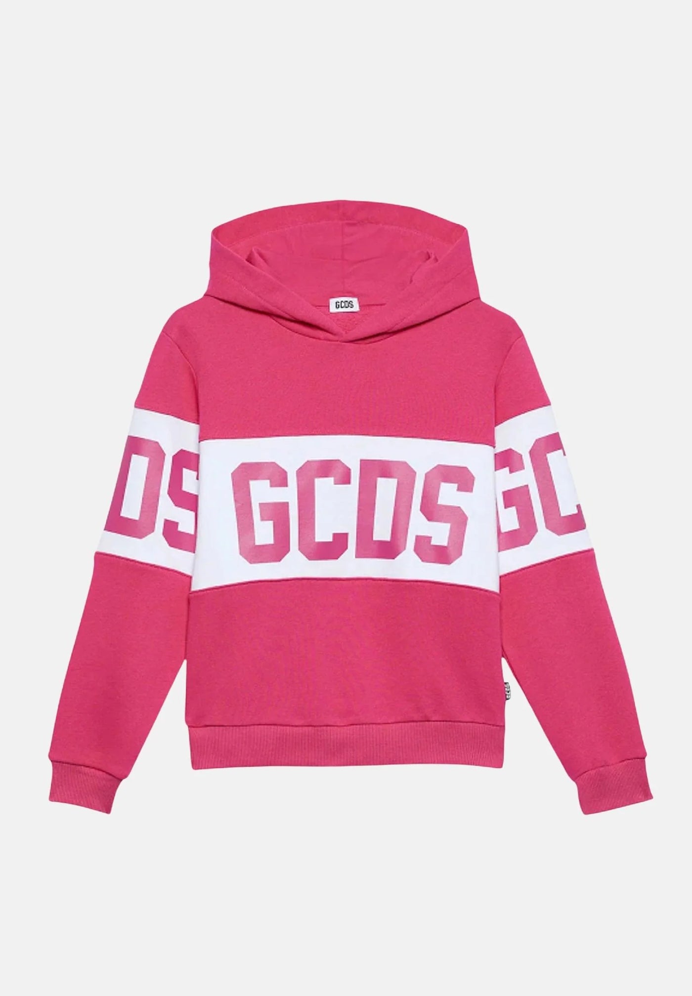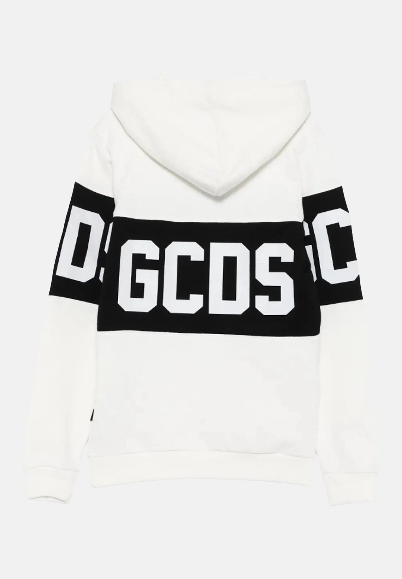 GCDS Felpa con cappuccio bianca per bambino e bambina. Realizzata in morbido cotone, è caratterizzata dalla maxi fascia nera a contrasto che corre orizzontalmente sul petto e sulle maniche, con il logo GCDS in grande evidenza. Il design pulito e moderno, unito al fit comodo, la rende perfetta per completare outfit casual e urban. Un capo versatile e di tendenza, ideale da indossare con jeans, jogger o sotto un giubbotto per un look dal carattere deciso. Si consiglia un lavaggio ed una stiratura a media temperatura. Stagione autunno inverno.