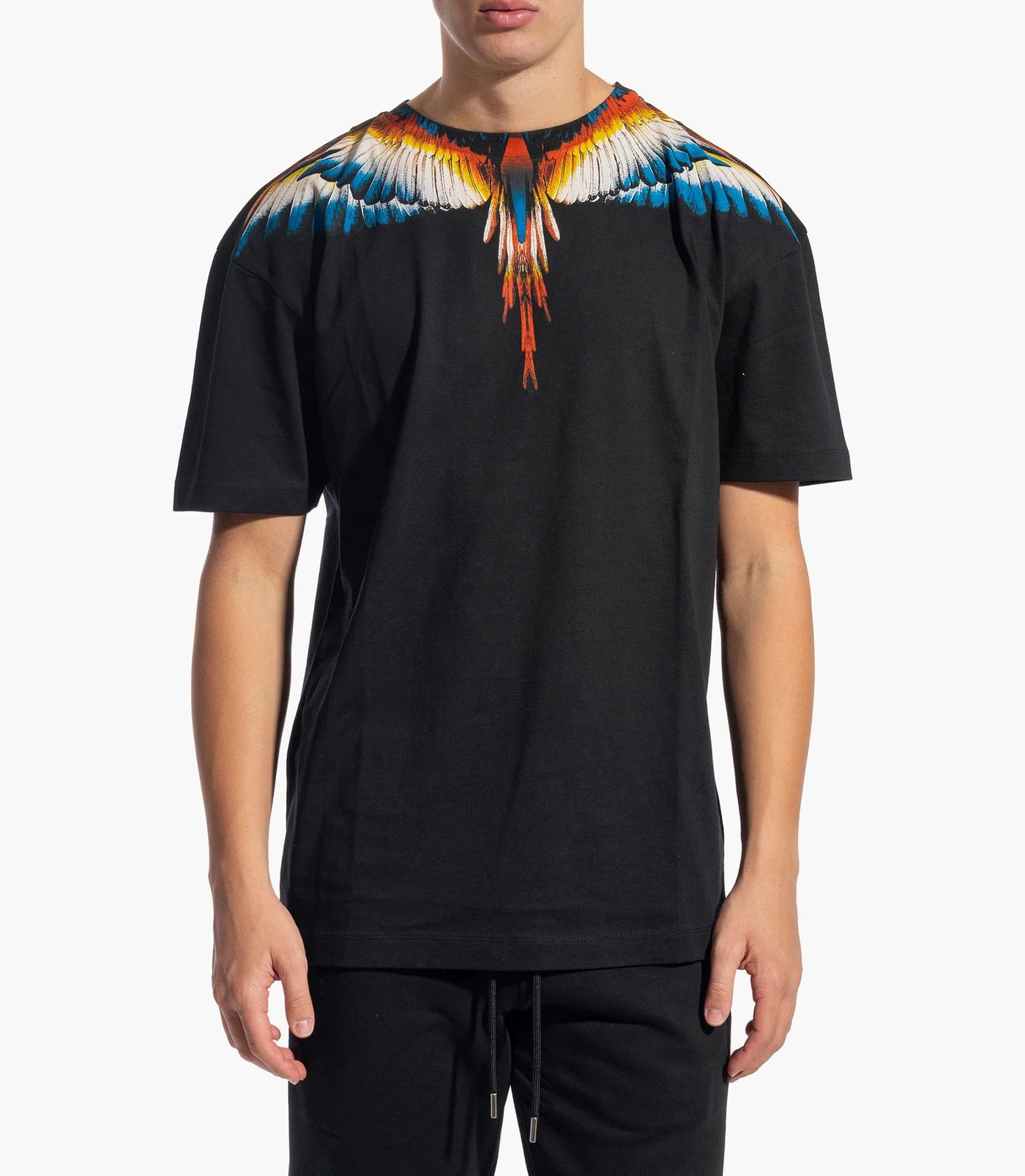 T-shirt a manica corta, caratterizzata dalla stampa di grandi ali multicolore che si aprono lungo lo scollo e le spalle, estendendosi anche sul retro. Vestibilità regular, girocollo classico e maniche corte. Un capo iconico e di forte impatto, perfetto per donare personalità anche al look più semplice.