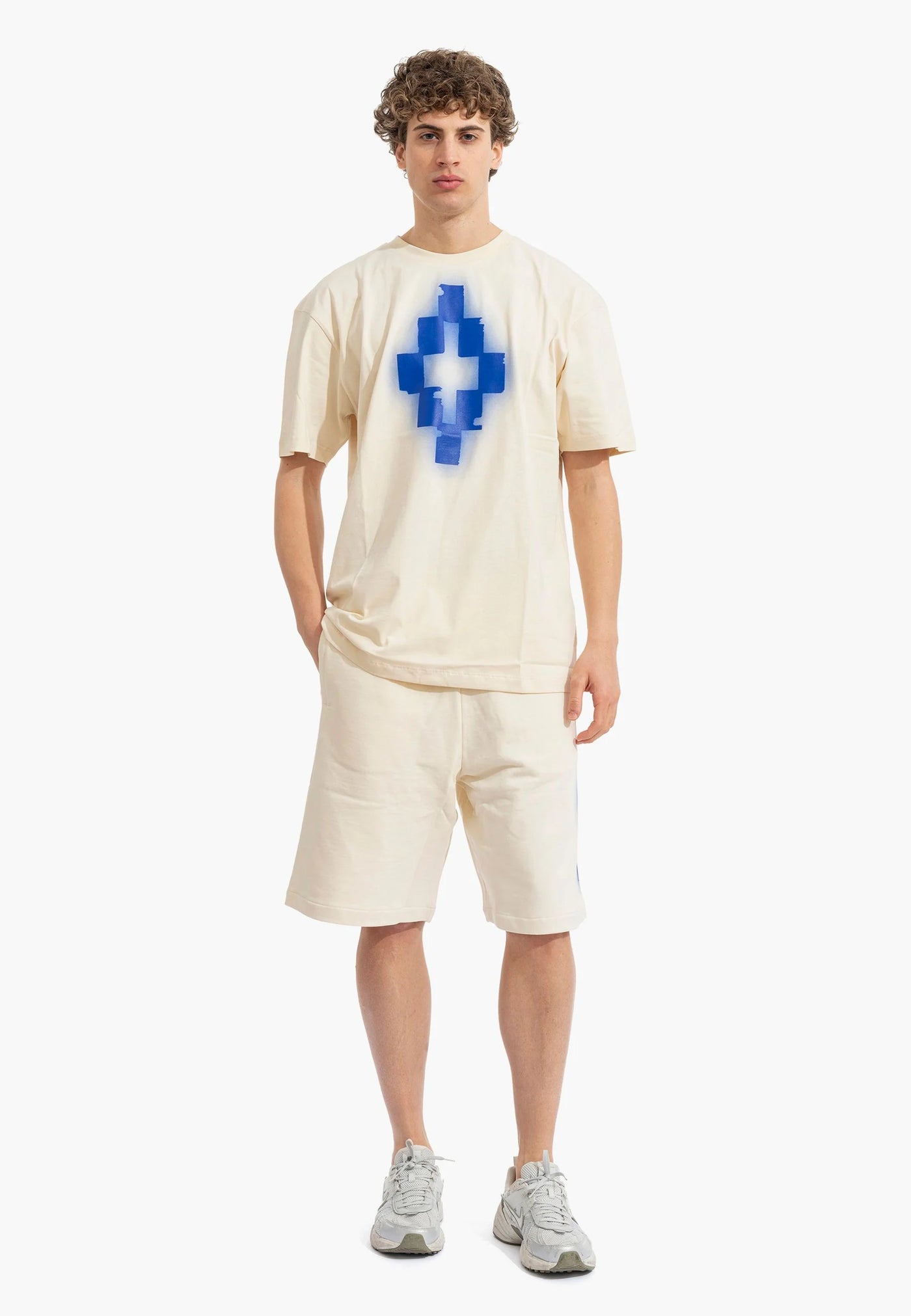 Completo a manica corta dal forte impatto visivo e dallo stile street contemporaneo, realizzata in cotone per offrire comfort e una vestibilità rilassata. Il design è caratterizzato da una stampa anteriore e posteriore ad evidenziatore, con la croce iconica protagonista che richiama l'estetica inconfondibile di Marcelo Burlon County of Milan. Un capo pensato per chi ama look urbani e di carattere, perfetto da abbinare a jeans o pantaloni casual per un outfit moderno e distintivo.