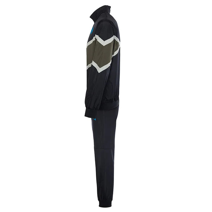 Il design della tuta è completato dai loghi e lettering ufficiali della SSC Napoli e EA7, posizionati sia sulla giacca che sui pantaloni, che testimoniano l'appartenenza alla squadra. I dettagli curati, come le tasche con zip e le cuciture rinforzate, assicurano praticità e resistenza, rendendo questa tuta ideale per il tempo libero.