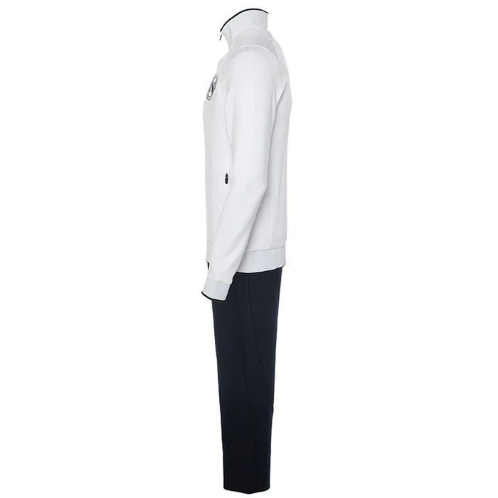 Tuta rappresentanza interlock bianca 2023/2024. Apertura frontale con zip, tasche laterali. Pantalone con fondo gamba in costina. 80% cotone, 20% poliestere