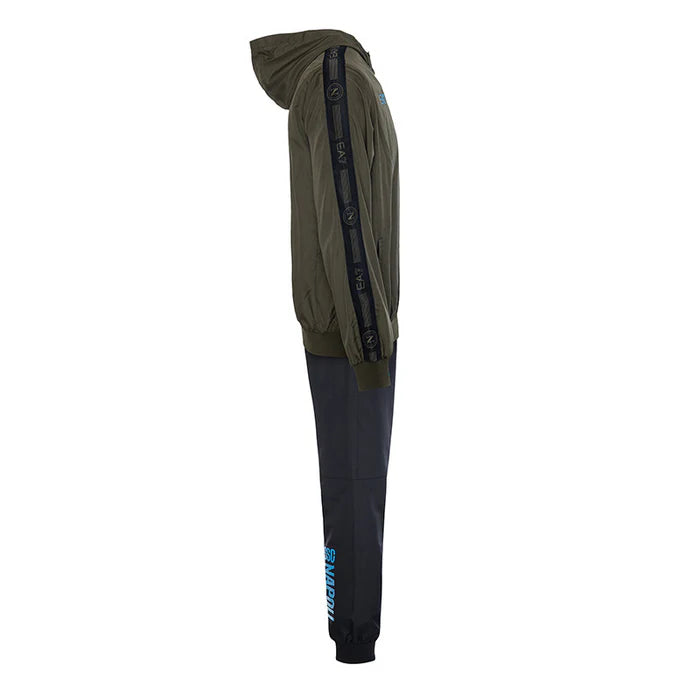 Il design della tuta è completato dai loghi e lettering ufficiali della SSC Napoli e EA7, posizionati sia sulla giacca che sui pantaloni, che testimoniano l'appartenenza alla squadra. I dettagli curati, come le tasche con zip e le cuciture rinforzate, assicurano praticità e resistenza, rendendo questa tuta ideale per il tempo libero.